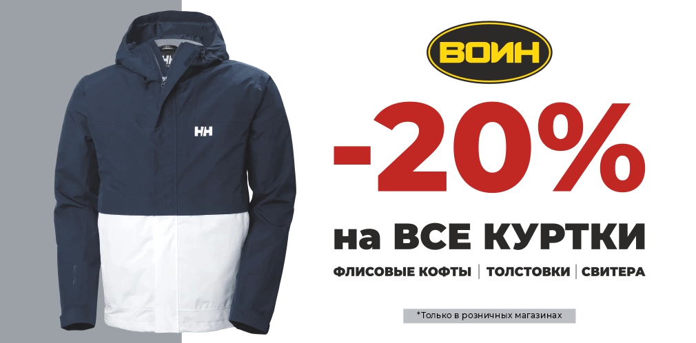 Скидка 20% на все куртки, флиски, толстовки и свитера.